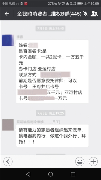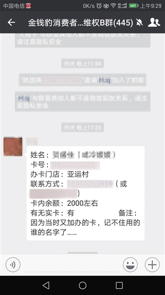 而在一个规模达400多人的金钱豹消费者维权群里,新京报记者注意到,北京、上海、天津、沈阳等地的多位金钱豹消费者称其储值卡内余额为几百到万余元不等,均处于“退卡无门”状态。