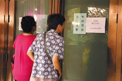 7月7日,金钱豹北京翠微店提示“暂停营业”,门店前聚集前来退卡的消费者。新京报实习生 张晓荣 摄