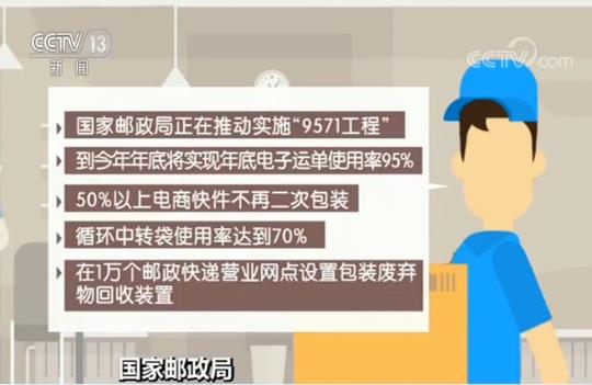 目前,国家邮政局正在推动实施“9571工程”,到今年年底将实现年底电子运单使用率95%,50%以上电商快件不再二次包装,循环中转袋使用率达到70%,在1万个邮政快递营业网点设置包装废弃物回收装置。组织申通等6家品牌企业开展可循环中转袋(箱)全面替代一次性塑料编织袋试点。据初步测算,每年可减少一次性塑料编织袋约2.07亿条。